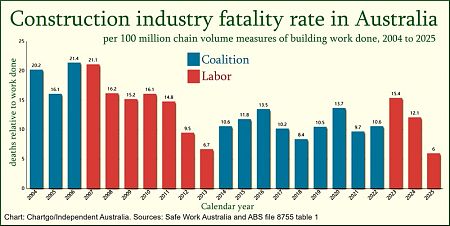 Construction workers killed soared after Abbott’s election, from 6.7 per $100 billion of building activity in 2013 to 10.6 in 2014. This leapt again in 2015 and 2016, to an appalling 13.5 deaths per $100 billion of output. This peaked higher still in 2020 at 13.7, more than double Labor’s final level in 2013.