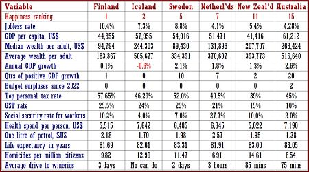 The following grid compares six nations on 15 indicators of a happy life. Australia is first on ten of these and second on the other five. It is way ahead of Finland on all of them.