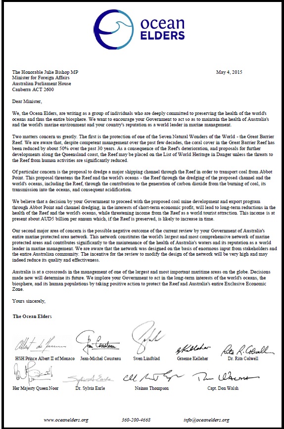 As the Ocean Elders wrote in their letter of May 4, 2015 to Julie Bishop: