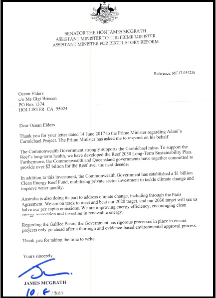 Senator James McGrath, Assistant Minister to the Prime Minister, replied to Ocean Elders on 10th August 2017, indicating that the PM had asked him to respond on his behalf: