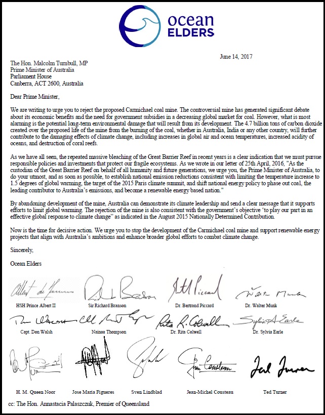 Undeterred, on 14 June 2017 Ocean Elders sent a letter to Malcolm Turnbull indicating collective alarm over