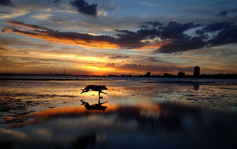 A dog, lost in the joy of the moment, races across Melbourne's St Kilda Beach at sunset. (Photo, circa 2005.)
