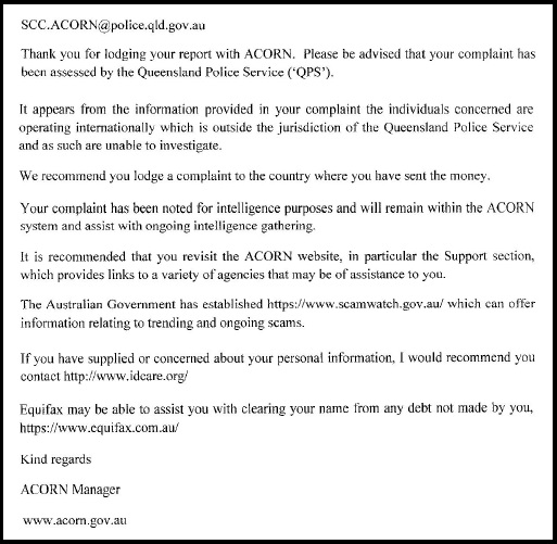A few days after that, I received a letter saying that, because the matter involved Russia, Queensland Police could not be involved because of jurisdiction and that my money was lost. The investigator did not even realise I had not paid any money, but the scammers had given me their money receiving account details.