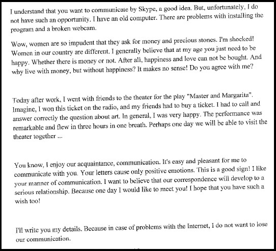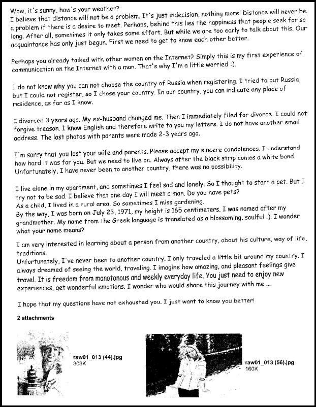 My friend had said her father went to Russia, so I brought this up. Pretty soon, she was going on holidays and would come to Australia. She reportedly organised flights and visas and so on, at a cost of the equivalent to $1,900. I did not ask if she had the money, but soon the idea I would pay for these emerged. Having been scammed by a major Australian bank, I saw the same system emerging. There was a mistake in the accounting and I would be responsible for the funds, even though she had made the mistake. She would demand more funding, and again, and then ultimately demand more until I was devoid of cash and assets. Then move on to the next customer.