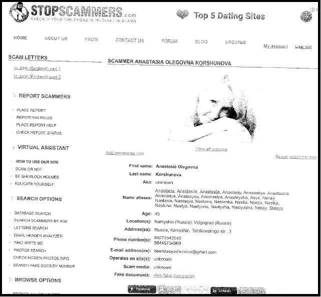 I had a new name to the photos and here were most of the ones I had received. I didn’t explore the site fully — I had enough to satisfy me. I contacted my romantic friend and was told the woman on Facebook had stolen her identity to make money from it. This was definitely a parallel with Australian bank scams: when faced with the truth always blame the other party, but never admit liability. I then checked further and found my romantic friend had advertised in the United States. I went further and joined a Russian scammers' identification site and found another name to the photo advertised in England, with an explanation from a man who had borrowed £8,000 for housing finance to clear his romantic friend’s mortgage and then was asked to find more money for an injured daughter’s operations. He refused, and published the name and photo as a scammer.