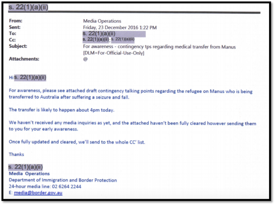 Yet by 1.22pm on 23 December 2016, the Department of Immigration and Border Protection (DIBP) media operations had already emailed various ministerial advisers, noting: