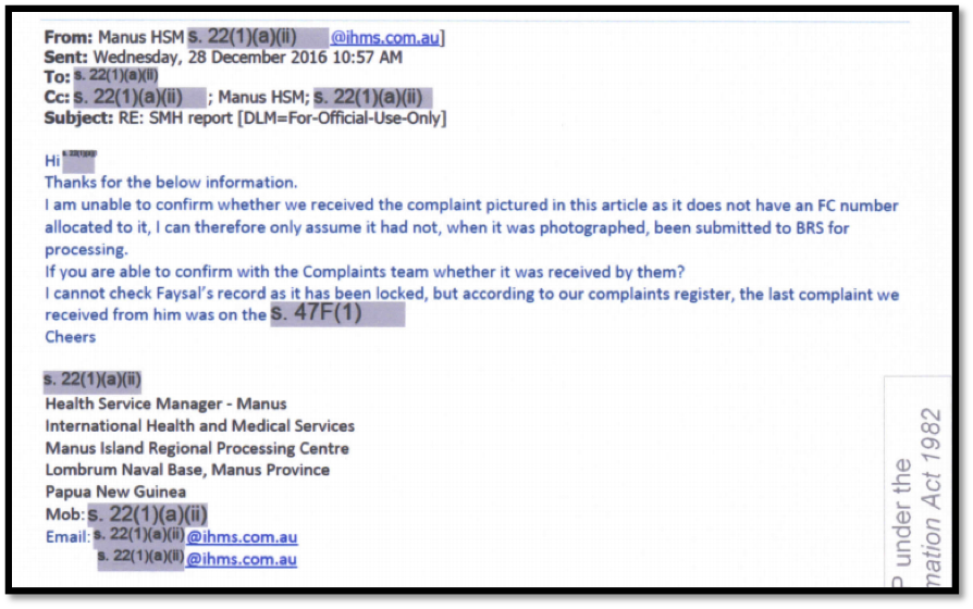 An email dated 28 December 2016 from the Manus health services manager to an unidentified recipient stated: