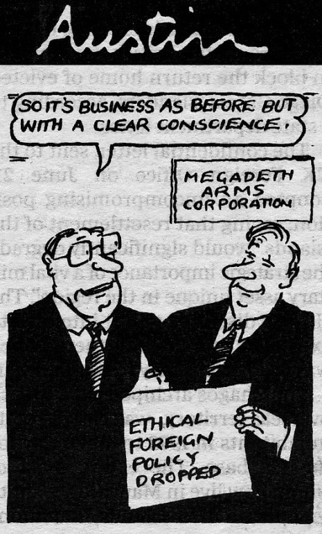 Foreign Minister Robin Cook was belatedly advised of the importance of BAE exports to the British balance of trade and economy in general — business as usual (Cartoon by David Austin via Guardian Weekly, 7 September 2000)