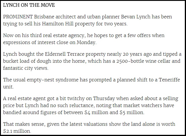 Prominent Brisbane architect and urban planner Bevan Lynch has been trying to sell his Hamilton Hill property for two years.