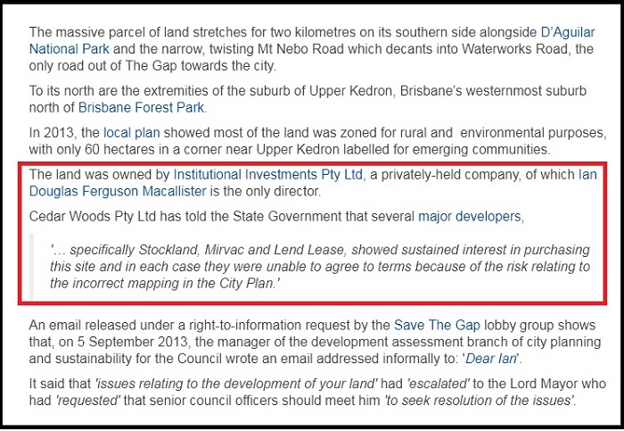 As reported by Independent Australia on June 2, Mr Lynch and Mr Macallister were brought together by Brisbane Lord Mayor Graham Quirk in order to solve "issues" regarding land owned by Mr Macallister's company, Institutional Investments Pty Ltd, at Upper Kedron.