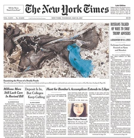 Five Eyes alliance betrayal. Front page of 'New York Times' featuring leaked information and photos from UK police and intelligence services.Trump forced to apologise. (Source: Adweek)