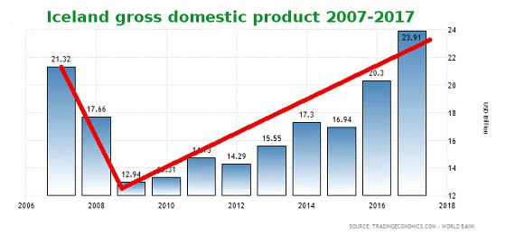 Iceland’s jobless rate is now down to 1.7%. Annual GDP growth is up to 7.2%. Iceland enjoys again the world’s highest median wealth at US$203,847 per adult.