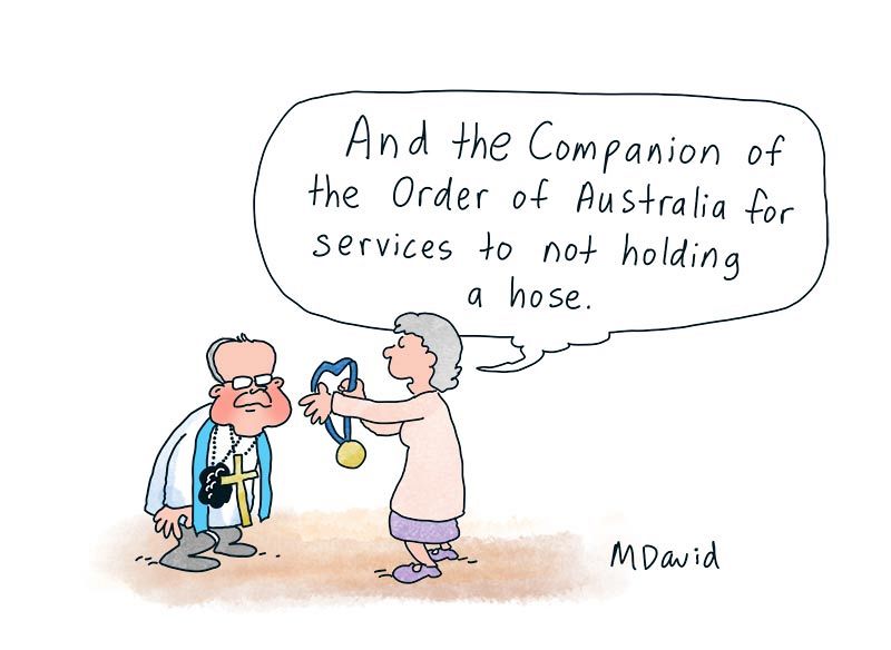 Scott Morrison – known for his inability to hold a hose and shirking all responsibility – has been handed the highest accolade in the land, a Companion of the Order of Australia (AC).
