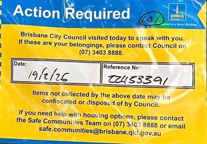 This was reportedly echoed by a QPS officer on the 18th when they were questioned by rough sleepers and community members as to why there were notice tags on all of the tents.