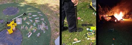 Attached to this media release were a few images: 1) needles; 2) a machete; and 3) a burning tent.