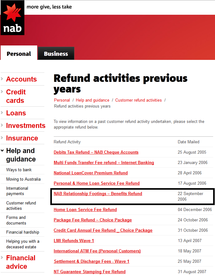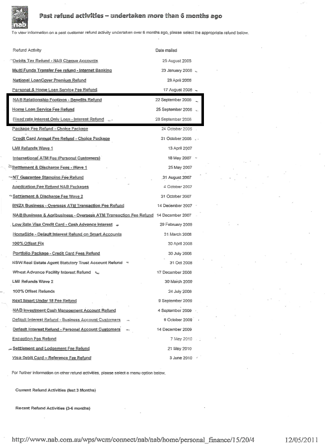 Scrutiny of the NAB’s ‘Past Refund Activities’ reveals that on May 11, 2011, there were three September 2006 listings for refunds. The first was dated September 22, 2006, for NAB Relationship Footings - Benefits Refund.