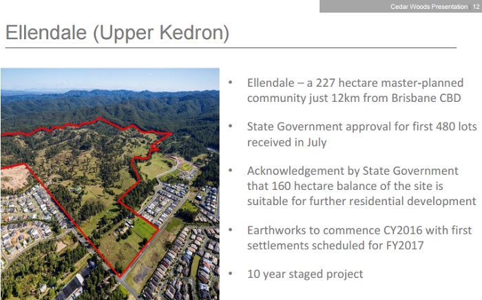 Screenshot from 2015 Cedar Woods Properties AGM brochure, which showed the site in question, which shows the site backs immediately onto national park on two sides (Document via Brisbane City Council)