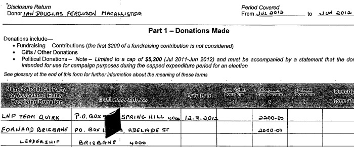 Mr Macallister told the Electoral Commission of Queensland in May 2013 he had donated $4,200 to LNP Team Quirk and Forward Brisbane Leadership in the 2012/13 financial year.