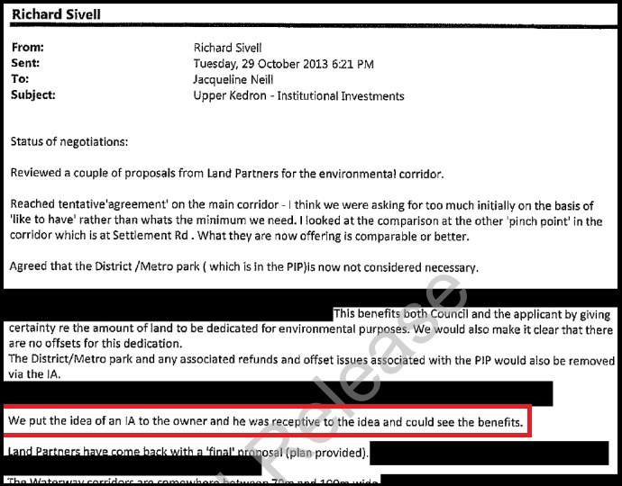 By 8 November 2013, the secret draft agreement had moved way beyond its stated objective of delivering 'open space and environmental corridors across the site' to a development 'master plan' with a 'draft subdivision layout'.
