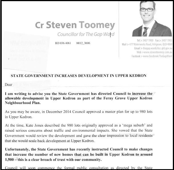 Steven Toomey, the LNP councillor for The Gap, sent a letter to every home in The Gap saying the Government had
