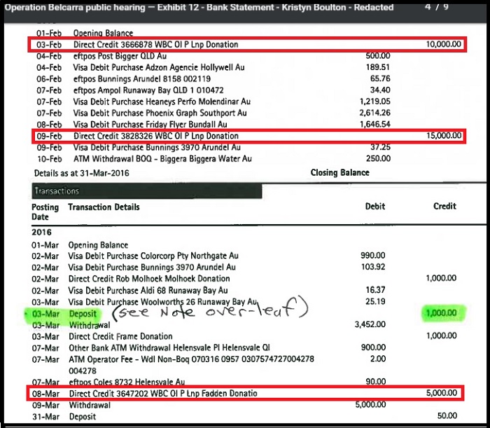 The questions that followed honed in on Boulton’s knowledge about the LNP contributing the lion’s share of her campaign funds. Boulton outlined how the $30,000 in question was deposited in three tranches. While Boulton conceded the hardcopy of her campaign account bank statement, which was submitted as evidence, identified the source for the first two deposits as 'LNP donation' and the final deposit as 'LNP/Fadden Forum', she said that during the campaign she had only done “phone banking”, which meant she has not seen that the money coming into her account had come directly from the LNP, rather than Robert.