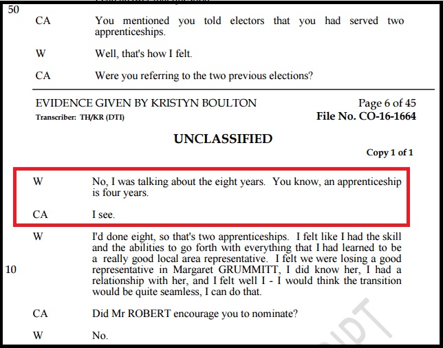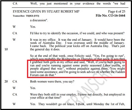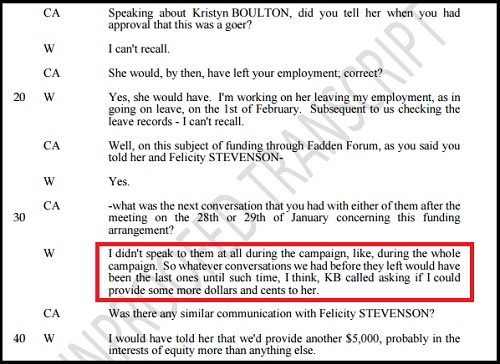 While Boulton struggled to recall the finer details of the Fadden Forum revelation, Robert suffered no such lack of clarity. The ignorance pleaded by Boulton was firmly blasted out of the water by him as he described in detail the occasion that Boulton attended a meeting with him and fellow candidate Felicity Stevenson in his office in late January. There he told both his then currently employed staffers that he would seek approval to use funds from the Fadden Forum to assist their respective campaigns.