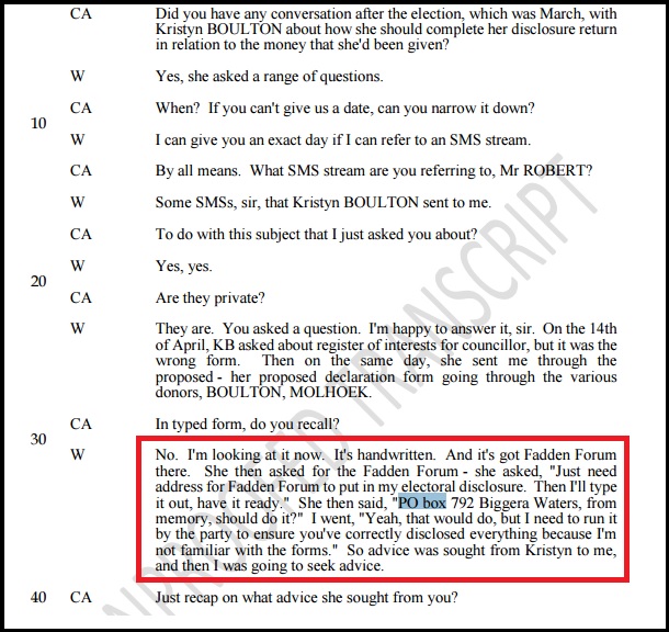 Strangely, Boulton’s failing recollection of all things Fadden Forum did not extend to not recalling its postal address, as revealed by Robert as he read out a private text exchange between himself and his former offsider.