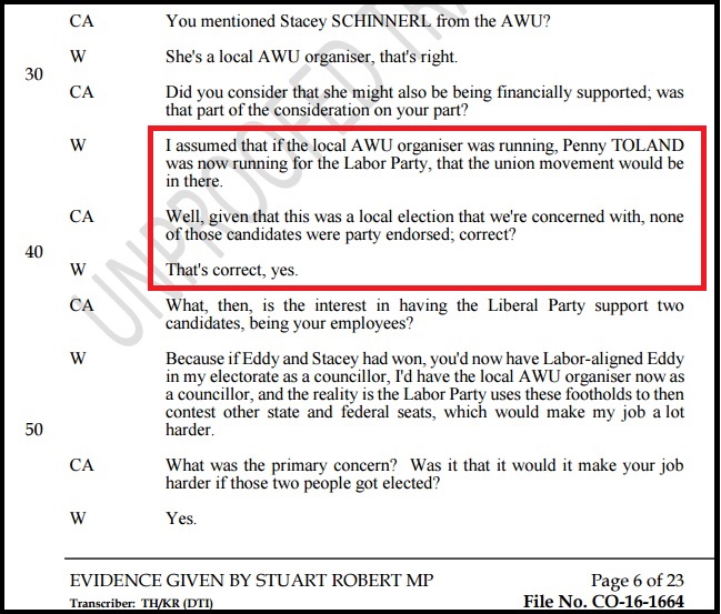 Interestingly Robert testified about his rationale for the donations, claiming: “Penny Toland, was now running for the Labor Party” in reference to my mayoral candidacy. In reality, ECQ disclosures clearly showed no donations or gifts in kind from the Labor Party.