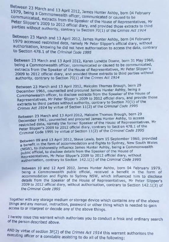 "They're looking for diary records, photographs, correspondence, notes, telecommunications records, travel records, accommodation records, postal records, receipts, spreadsheets, and newspaper articles that relate to the diaries of Peter Slipper."